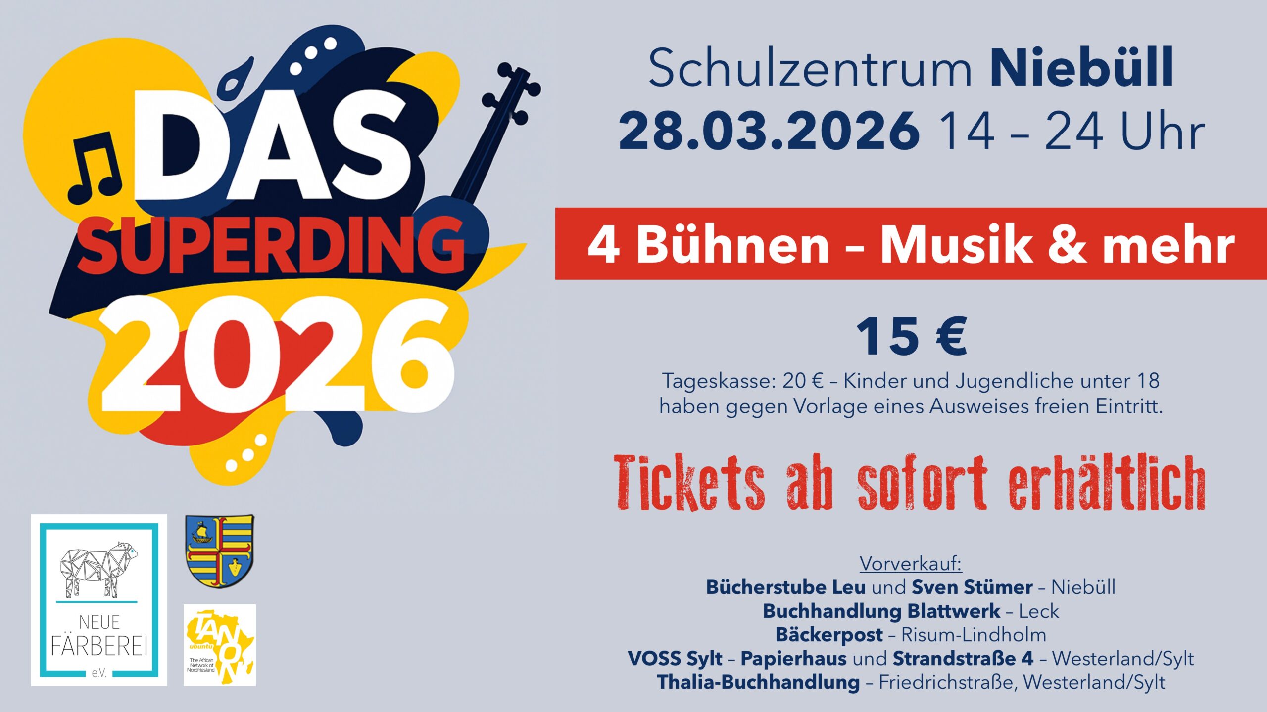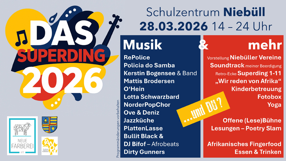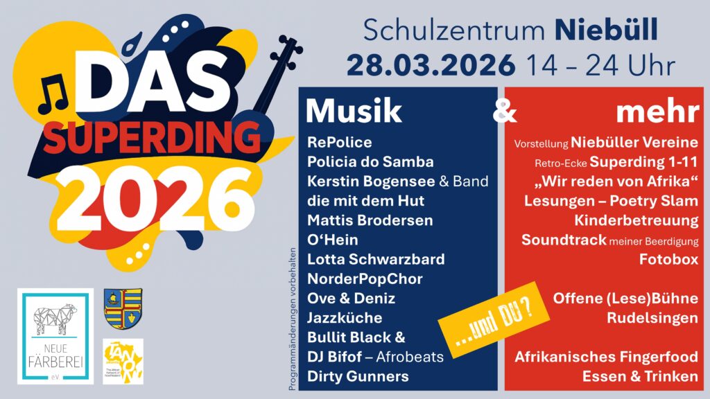 Nach drei Jahrzehnten Pause erlebt die traditionsreiche Veranstaltung „Das Superding“ im Jahr 2026 ihre Neuauflage. Von 1979 bis 1996 war das „Superding“ elf Mal ein fester Be-standteil des städtischen Kulturlebens – ein Fest, das Kino, Musik, Tanz und vielfältige An-gebote zusammenbrachte und die Menschen der Region vereinte. Nun knüpft die „Neue Färberei“ Kulturhaus Niebüll e.V. gemeinsam mit TANON (The African Network Of Nord-friesland) und dem Stadtmarketing Niebüll an diese Tradition an und lädt am 28.03.2026 zu einem bunten Programm im Schulzentrum und der Stadthalle ein.