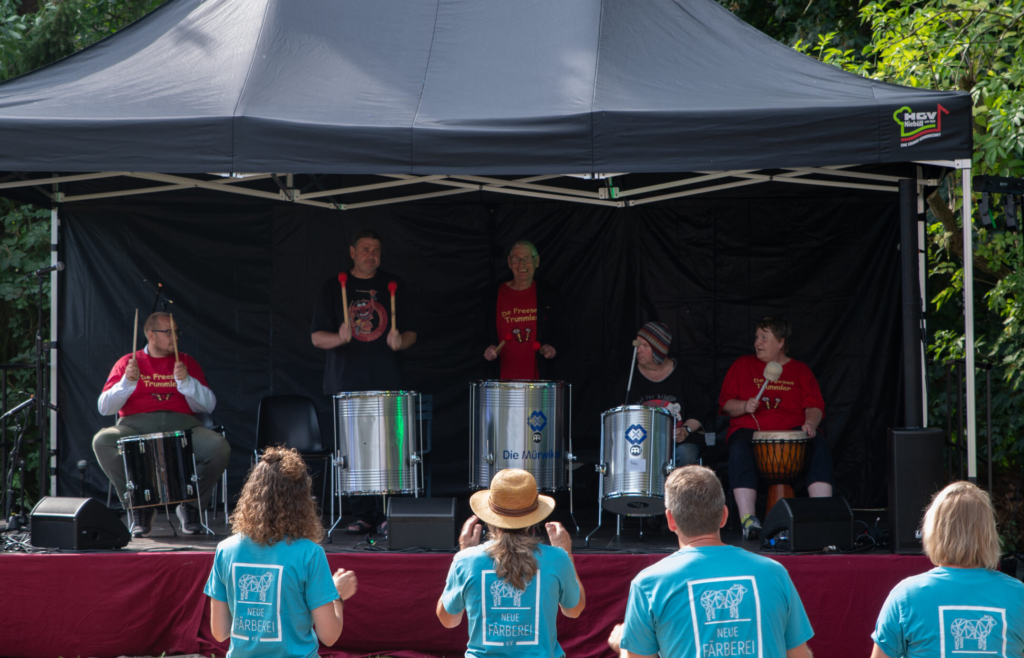 | …sind die Trommeltruppe der Mürwiker Werkstätten in Niebüll und für ihre gute Laune bekannt. Für die Neue Färberei haben sie bereits die Alternative Kulturnacht 2024 eröffnet. Angeleitet von Arne „BigBeat“ Berger werden „De Freesentrummler“ energiegeladen und lautstark „Das Superding 2026“ eröffnen. |